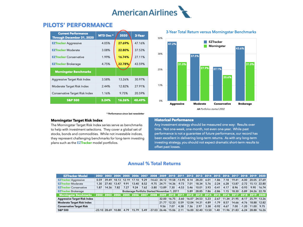 EZTracker began publishing the American Airlines 401k newsletter in 2002. While past performance is not a guarantee of future performance, EZTracker's record has been excellent in delivering superior long-term results.